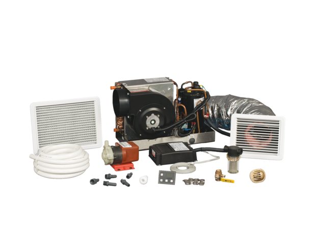 Indholdspakke: klimaanlæg, elektronisk styring og havvandspumpe, filter, kontrolpanel, havvands-, luft- og udsugningsluftføringer i gitter, havvandsslange, gennemføringselementer til bræddevæg, monteringsmaterialer, fittings, ventiler * Leveres efter behov