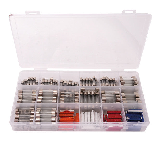 270 stk glas- og porcelænssikringer i plastbox fra 1 til 30 Amp.