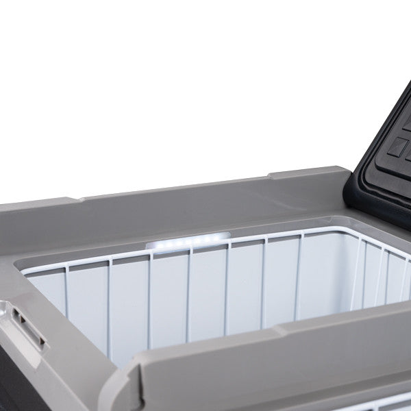 95 Liter mit LED-Licht, das sich beim Öffnen des Deckels einschaltet. Ausgestattet mit stabilen Tragegriffen und einem Display, das die Temperatur anzeigt.
