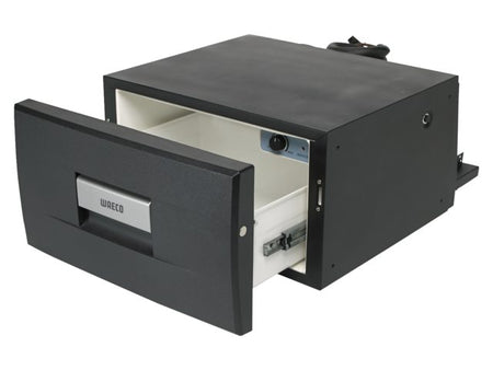Kompakt køleskuffe udstyret med kraftig kompressor, der kan monteres separat. Skuffen kører på glatte rullelejer i et metalhus. Temperaturstyring med trinløs termostat, oplåsning og åbning med ét enkelt træk. Den ideelle køleskuffe til brug på skibets bro. Lavspændingsbeskyttelse/elektronisk sikring.