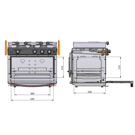 Elektronische Zündung von Brenner und Ofen. Brenner: 1 kW, 1,75 kW und 2,5 kW. Backofen: 1,8 kW, 25 Liter. inkl. Topflappen.