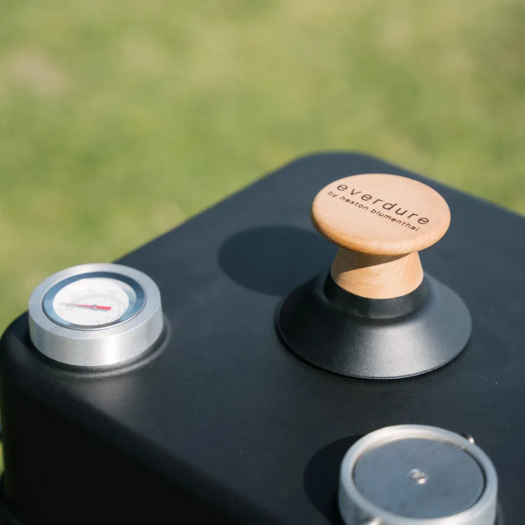 Dens H-brænder i rustfrit stål og støbejernsgrill sikrer jævn opvarmning, mens stegehætten med temperaturmåler og luftventil giver alsidige madlavningsmuligheder.