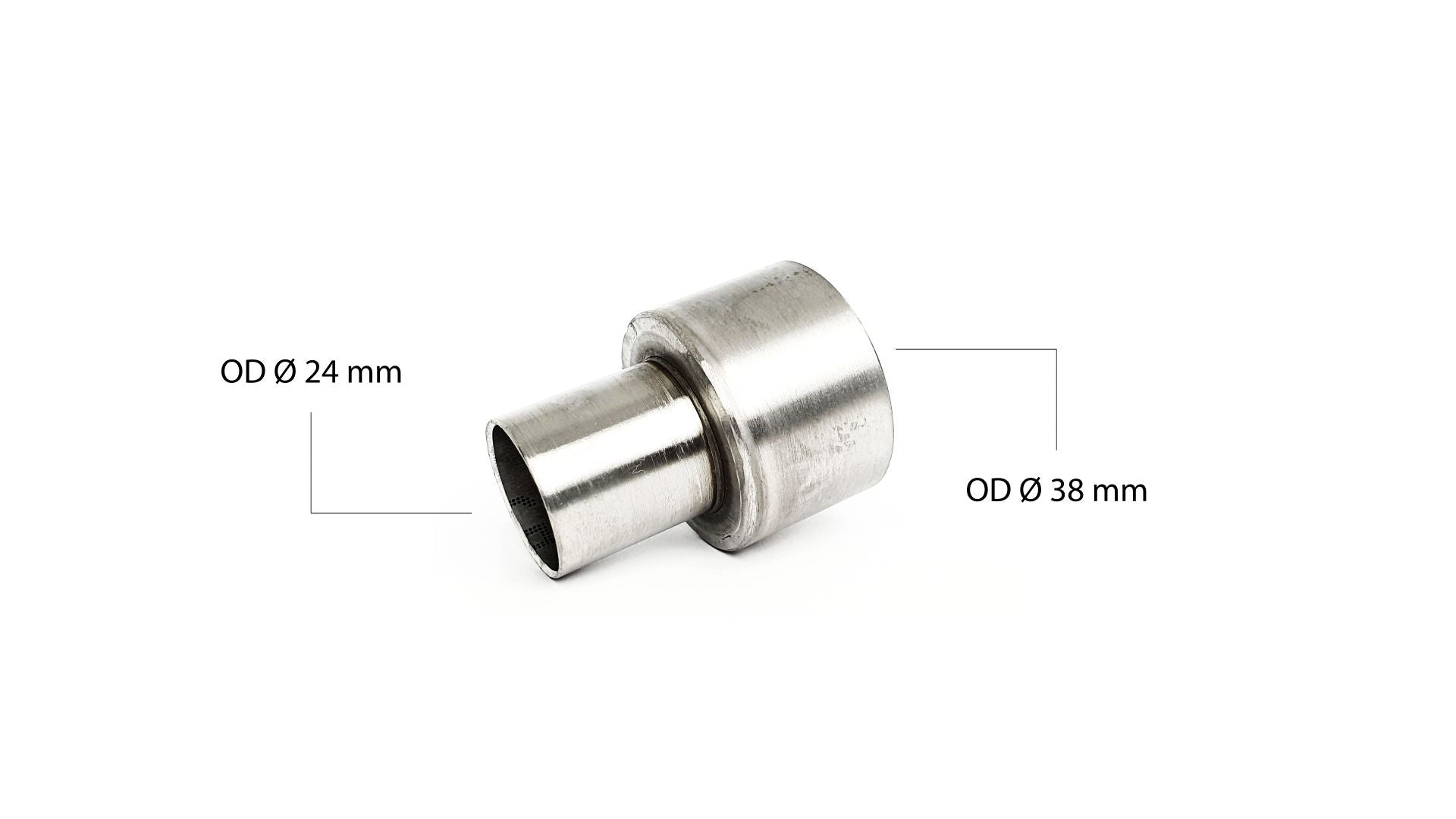 Denne udstødningsrørsovergang reducerer modtrykket ved at ekstrudere det originale 24 mm udstødningsrør til 38 mm udstødningsrør, hvis der er behov for et længere udstødningsrør.