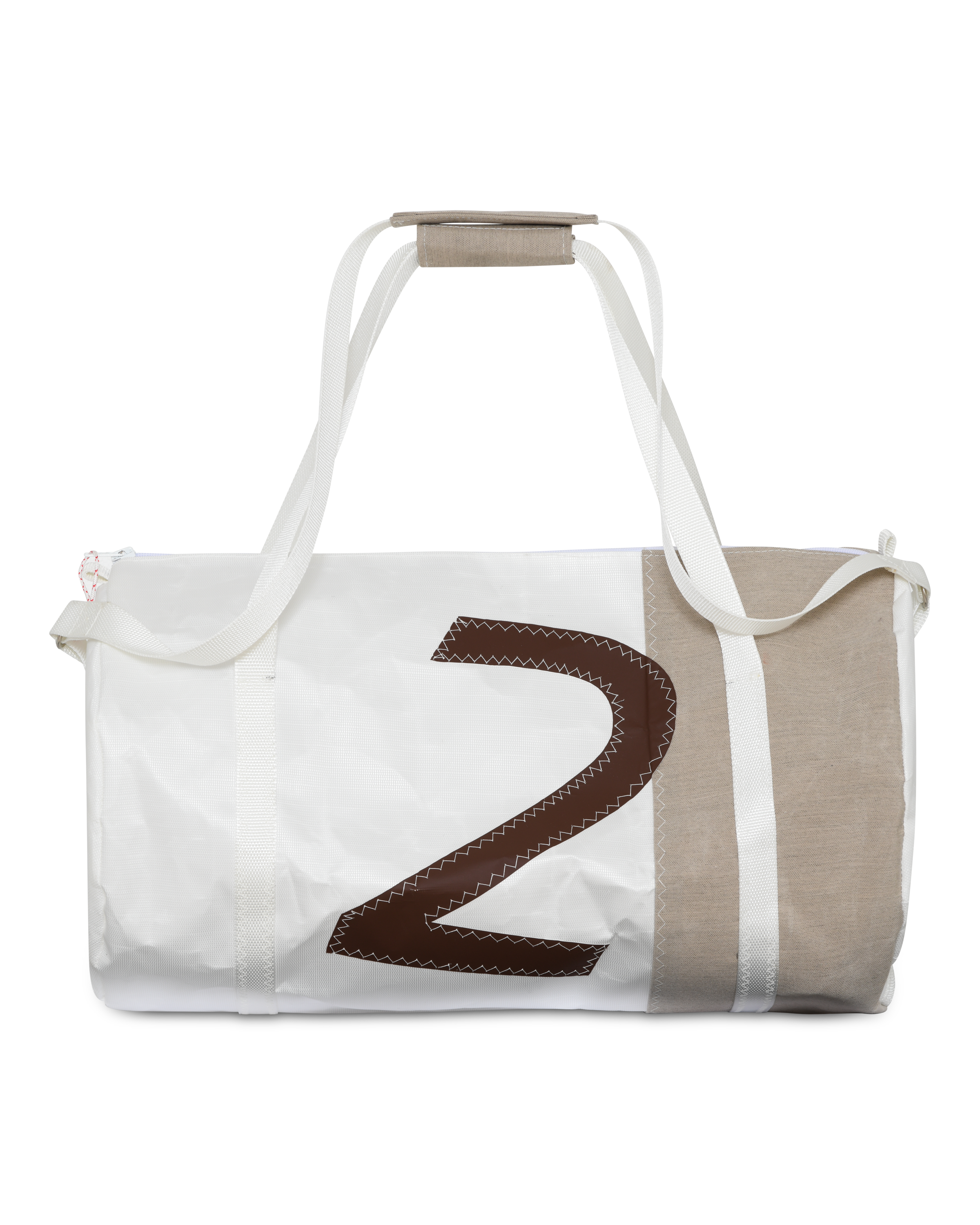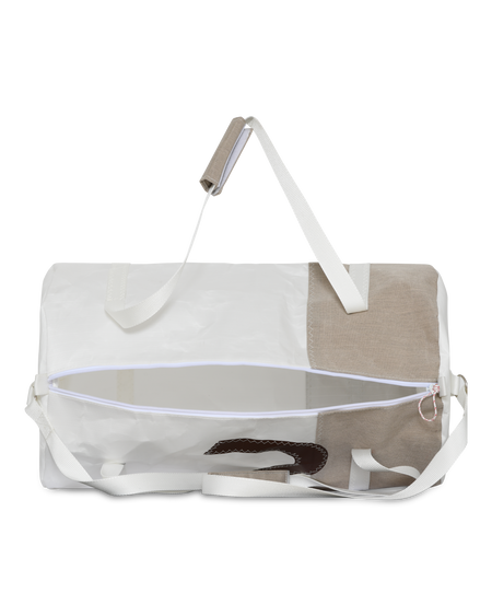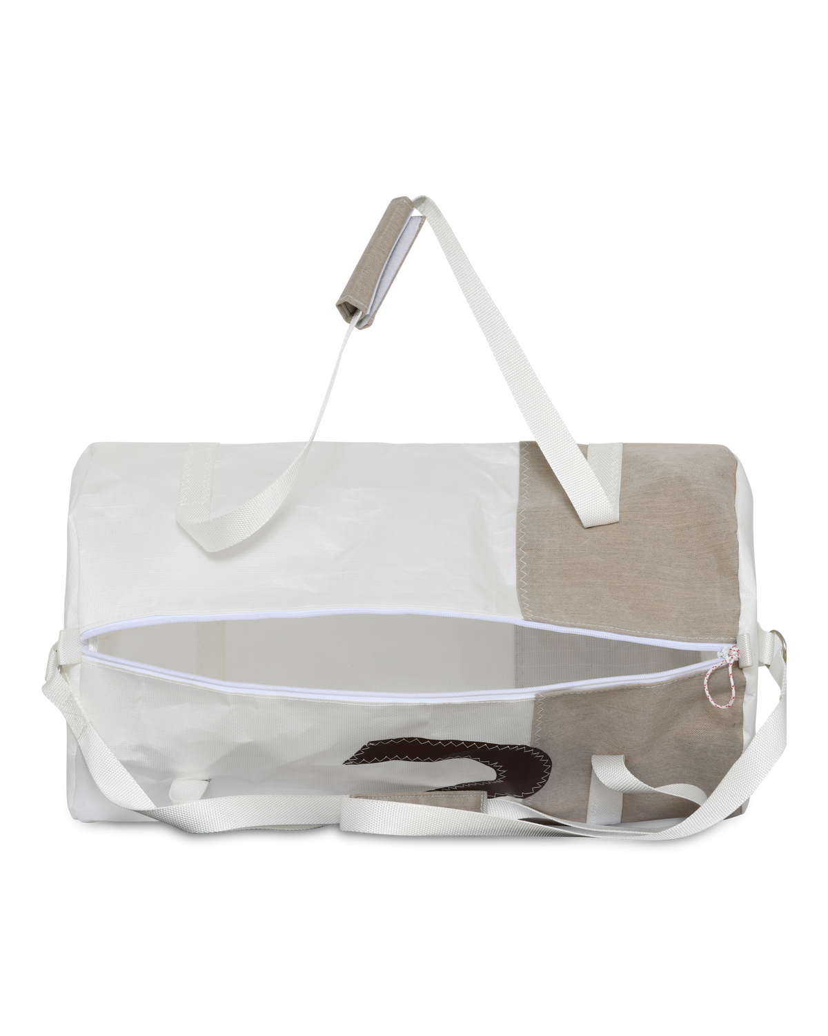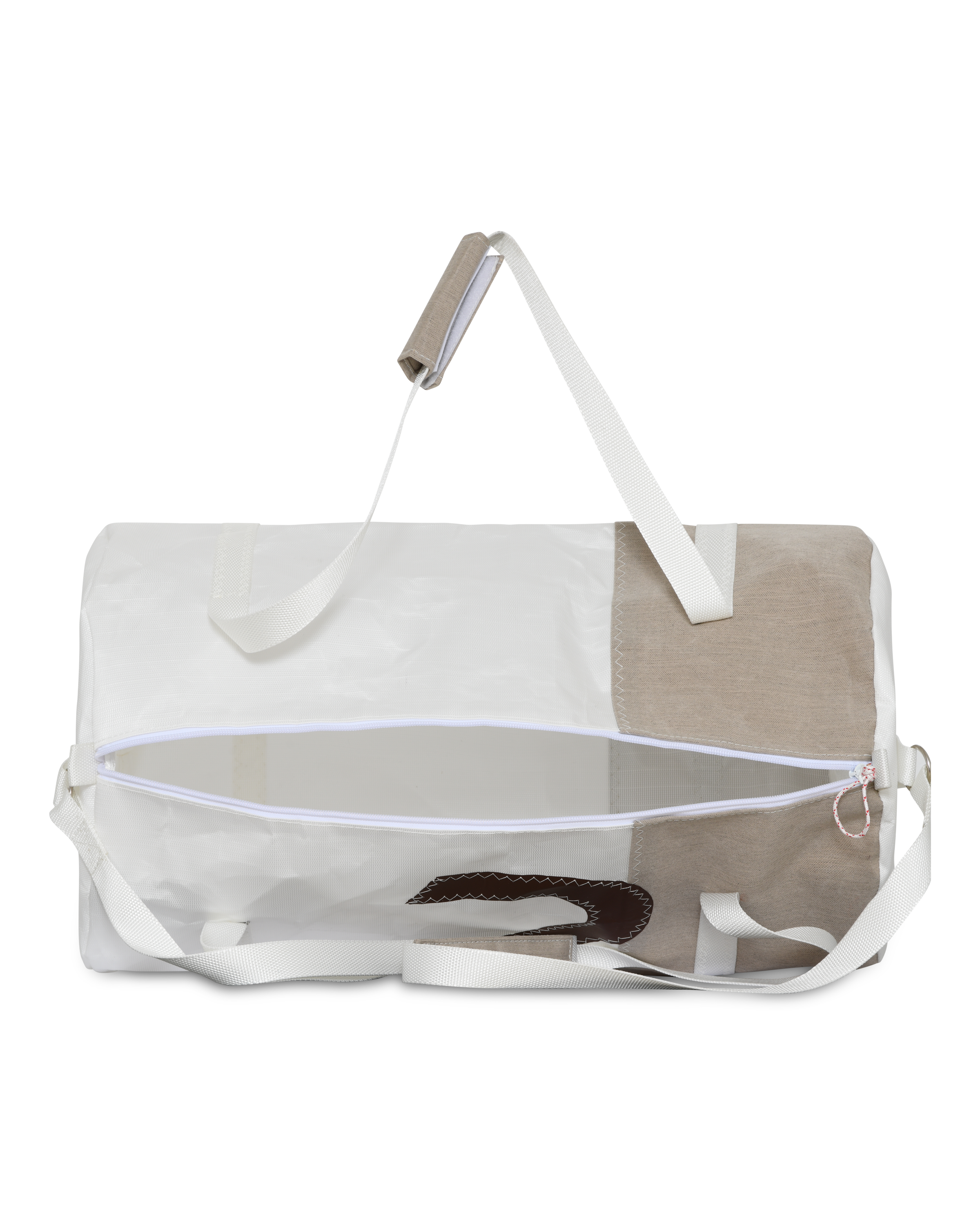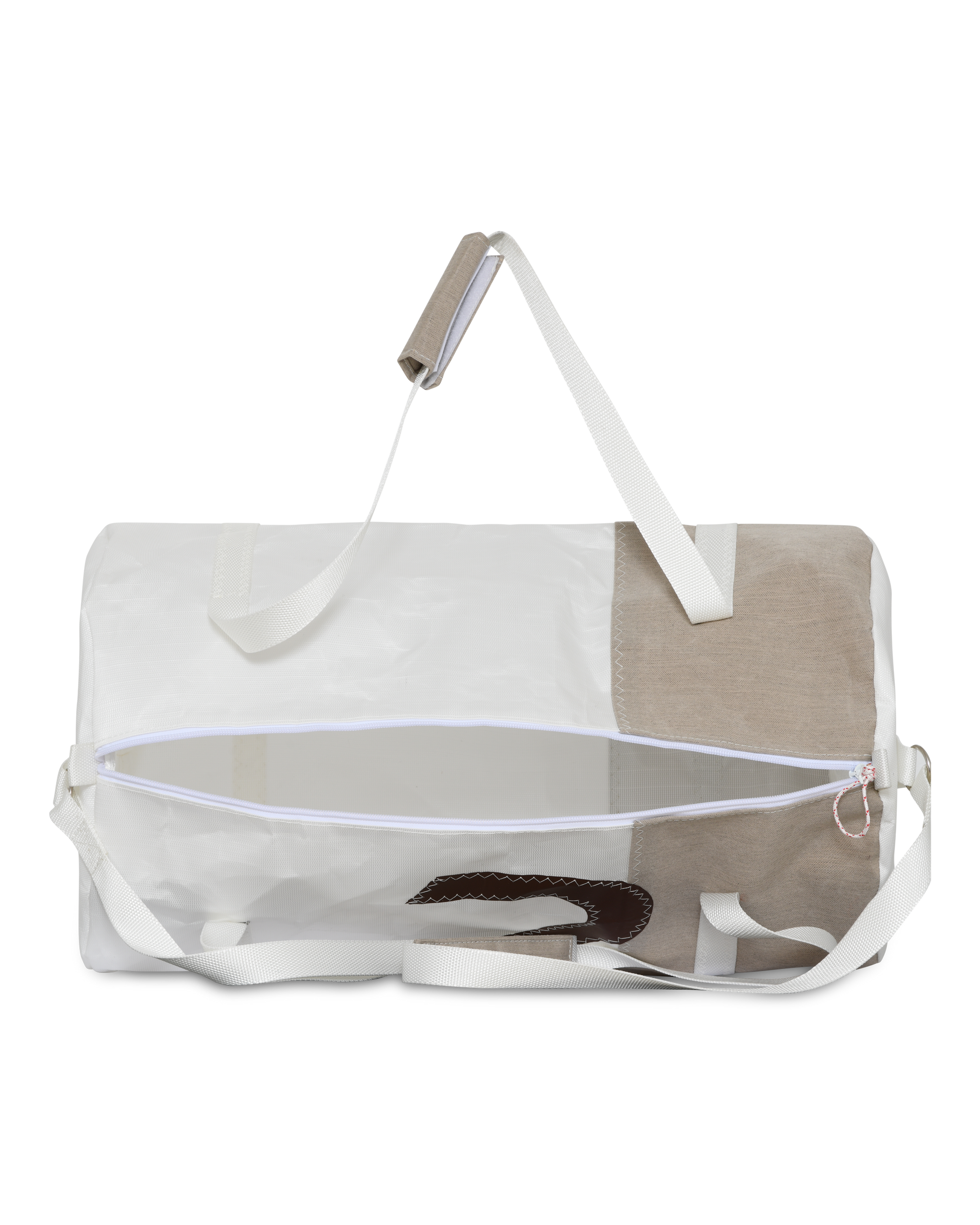 Our Sailbag is an elegant weekend bag crafted from Hydranet sailcloth or a similar material, featuring a canvas lining. Made from white sailcloth, the bag is available in either brown or white canvas.